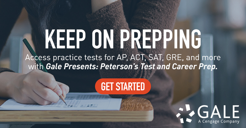 Prepare for standardized tests with eBooks, online courses, and full-length practice tests for GED, SAT, ACT, AP, PSAT, GRE, LSAT, MCAT, TOEFL, U.S. citizenship, and more in Gale Presents: Peterson’s Test and Career Prep.