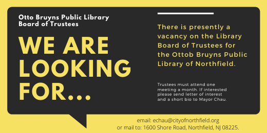 22 hours a week, $12 an hour, Monday and Tuesday evenings, Friday and Saturday. The Otto Bruyns Public Library of Northfield has a part-time position available for a “Library Assistant”. Looking for a local resident with strong customer service skills, superior technical skills, an exciting imagination and a willingness to learn and grow with the library community. Responsibilities could include newsletter production, Story Time, Maker Space coordination, as well as basic Library Assistant duties. Applications are available at the Northfield Public Library, 241 W. Mill Road, Northfield, NJ 08225, please stop in to pick one up. In addition to the print application, resumes must be submitted electronically to This email address is being protected from spambots. You need JavaScript enabled to view it.. Application will be accepted until position is filled.